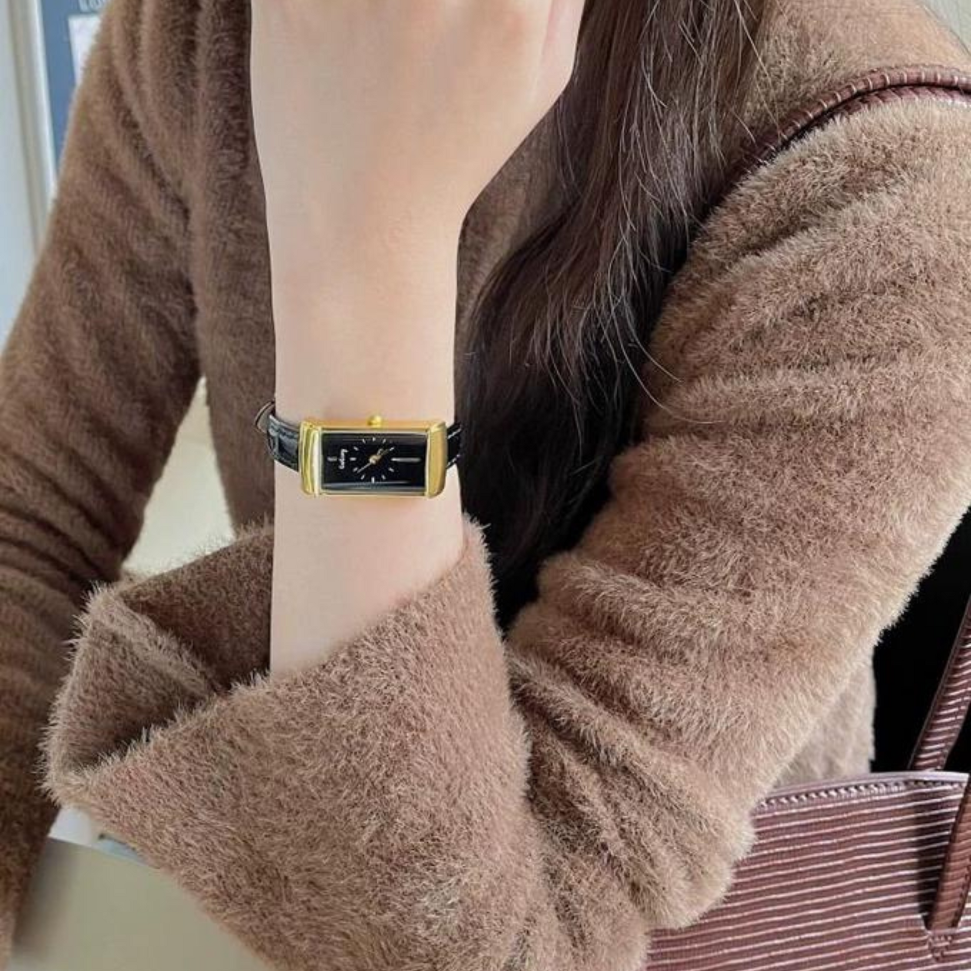 ساعة نسائية بجلد أسود ولمسة ذهبية